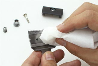 刃先に付いている毛やゴミをブラシで払うように取りのぞいた後、ネジを外して刃を分解します。
